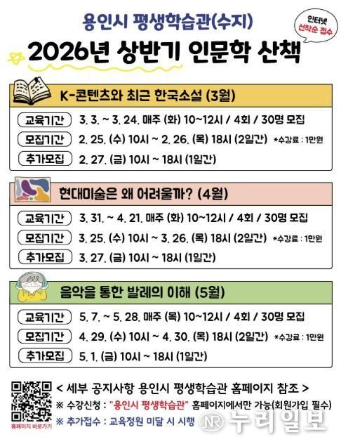 (누리일보) 용인특례시는 25일부터 수지구에 있는 용인시평생학습관에서 인문학 산책 수강생을 모집한다고 13일 밝혔다.