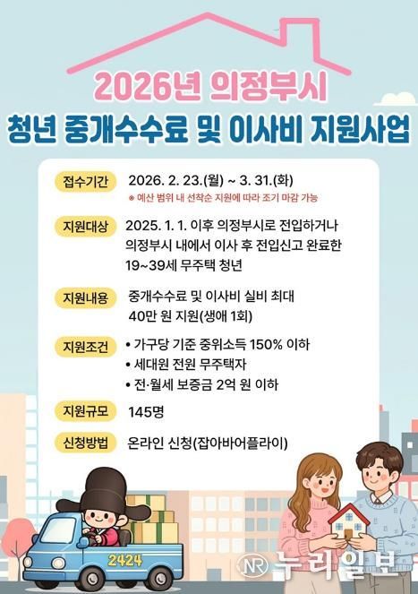 (누리일보) 의정부시는 청년들의 주거 이전 비용 부담을 줄이기 위한 ‘2026년 청년 중개수수료 및 이사비 지원사업’의 신청자를 모집한다.