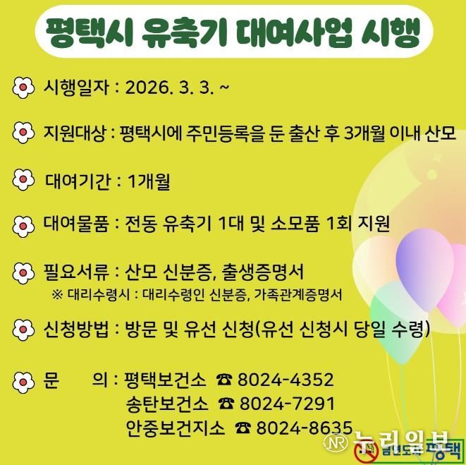 (누리일보) 평택시는 출산 초기 산모의 경제적 부담을 덜고 안정적인 모유 수유 환경조성을 위해 오는 3월 3일부터 유축기 대여사업을 신규 시행한다고 밝혔다.