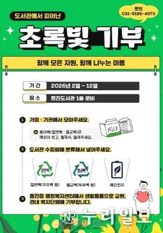 (누리일보) 김포시 통진도서관은 2월부터 12월까지 시민들과 함께 환경을 보호하고 소외된 이웃을 돕는 자원순환 나눔 프로그램 ‘도서관에서 피어난 초록빛 기부’를 운영한다고 밝혔다.