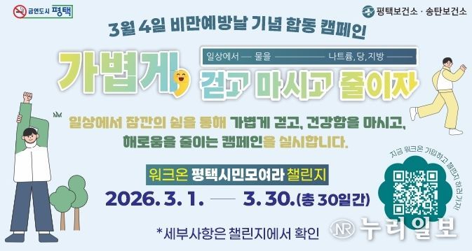 (누리일보) 평택시는 오는 3월 4일 ‘비만 예방의 날’을 맞아, 3월 한 달간 시민과 함께하는 ‘가볍게 걷고, 마시고 줄이자’ 합동 캠페인을 대대적으로 전개한다고 밝혔다.