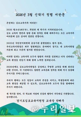 (누리일보) 김포교육지원청은 2026년 3월 신학기를 맞아 관내 학교를 대상으로 ‘교육장 청렴 서한문’을 발송했다고 밝혔다.