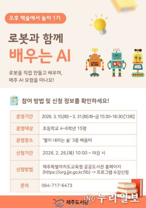 (누리일보) 제주도교육청 제주도서관은 25일 방과 후 어린이를 대상으로 도서관 공간을 활용한 체험 중심 프로그램 ‘2026 오후 책숲에서 놀자’ 1기 ‘로봇과 함께 배우는 인공지능(AI)’ 참가자를 모집한다.