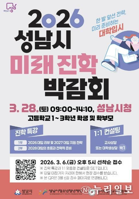(누리일보) 성남시청소년청년재단은 오는 3월 28일 오전 9시부터 오후 2시 10분까지 성남시청에서 '2026 성남시 미래진학박람회'를 개최한다고 밝혔다. 이번 박람회는 성남시 고등학교 1~3학년 학생과 학부모를 대상으로 진행된다.