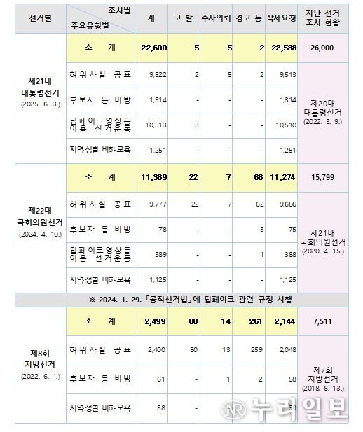 중앙선관위는 딥페이크 제작물이나 허위사실공표·비방 행위는 후보자에게 회복하기 어려운 피해를 줄 수 있고 유권자의 판단을 왜곡하여 선거결과에 영향을 미칠 수 있다면서, 깨끗한 사이버선거문화 조성을 위해 관계기관 등의 적극적인 협조를 요청했다.