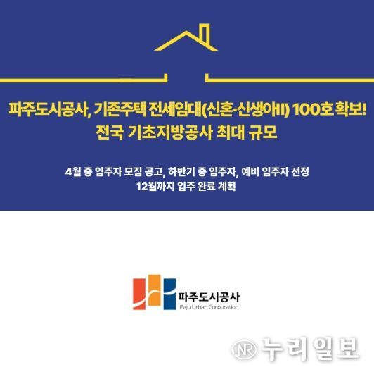 (누리일보) 파주도시공사는 지난 25일 ‘기존주택 전세임대(신혼·신생아Ⅱ유형)’ 사업 물량 100호에 대한 공급계획 승인신청서를 국토교통부에 제출했다고 밝혔다.