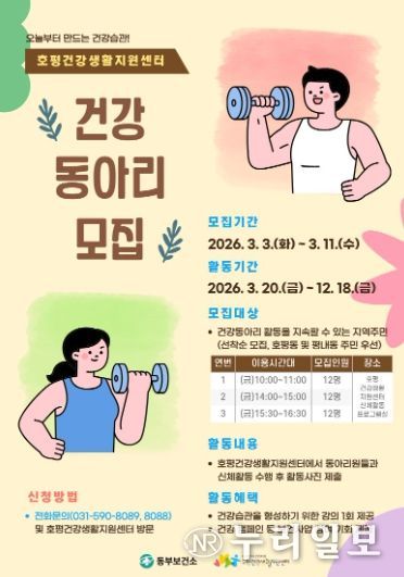 (누리일보) 남양주시는 오는 3월 3일부터 11일까지 동부보건소 호평건강생활지원센터에서 지역주민을 대상으로 건강동아리 참여자를 모집한다고 26일 밝혔다.