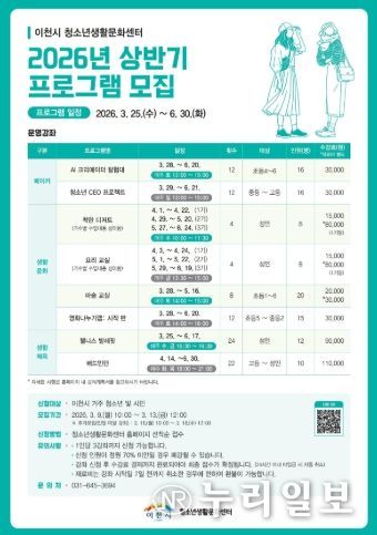 (누리일보) 이천시 청소년생활문화센터가 청소년과 지역주민의 건강한 생활문화 형성과 역량 강화를 위해 ‘2026년 상반기 프로그램’을 운영하고 수강생을 모집한다고 밝혔다.