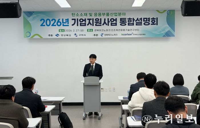(누리일보) 경상북도는 27일 구미시 산동읍에 위치한 경북테크노파크 인조흑연응용기술연구센터에서 도내 기업 및 유관기관 관계자 50여 명이 참석한 가운데 '2026년 탄소산업 기업지원사업 통합설명회'를 개최했다.