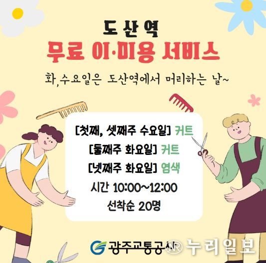 (누리일보) 광주교통공사(사장 문석환)는 광산구자원봉사센터(이사장 박병기)와 함께 지역사회 상생과 나눔 실천을 위해 3월부터 11월까지 광산구 도산역에서 지역 주민을 대상으로 무료 이·미용 서비스를 운영한다.