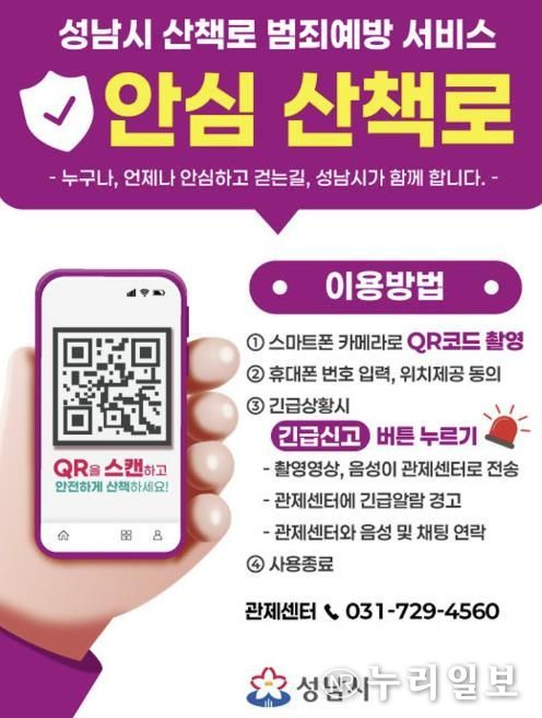 (누리일보) 성남시는 시민들이 보다 안심하고 산책로를 이용할 수 있도록 영장산과 불곡산 일대 산책로에 ‘범죄예방 서비스’를 6일부터 도입한다.