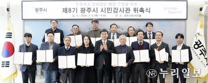 (누리일보) 광주시는 지난 5일 시청 비전홀에서 제8기 시민감사관(명예감사관·전문감사관) 위촉식을 열고 앞으로 활동 방향을 공유했다.