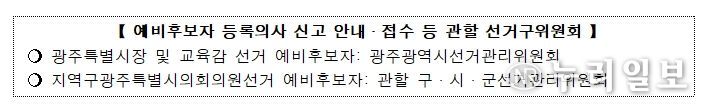 (누리일보) 중앙선관위는 3월 5일 '전남광주통합특별시 설치를 위한 특별법'이 공포됨에 따라, 전남, 광주의 시·도지사(교육감 포함) 및 지역구시·도의회의원 선거의 예비후보자가 그 신분을 유지하려면 3월 16일까지 예비후보자 등록의사를 관할 선거구위원회에 서면으로 신고해야 한다고 밝혔다.
