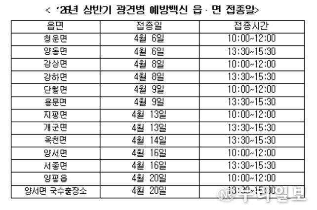 양평군은 인수공통전염병인 광견병을 예방하기 위해 연 2회 예방접종 사업을 실시하고 있다. 2026년 상반기 접종 대상은 동물등록이 된 관내 생후 3개월 이상 반려견과 반려묘이다.