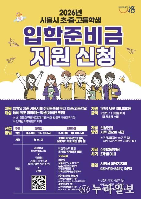 (누리일보) 시흥시는 지난 3월 3일부터 ‘시흥시 초중고 입학준비금 지원사업’ 신청을 받고 있다. 이번 사업은 입학 준비에 필요한 비용을 보편적으로 지원해 교육기본권을 강화하고 학부모의 경제적 부담을 완화하기 위해 올해 처음 시행되는 제도다.