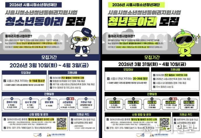 (누리일보) 시흥시와 시흥시청소년청년재단은 지역 청소년과 청년의 자율적인 동아리 활동을 지원하고 건강한 문화 형성을 위해 ‘2026년 시흥시 청소년ㆍ청년 동아리 지원사업’에 참여할 동아리 670개를 모집한다고 밝혔다.