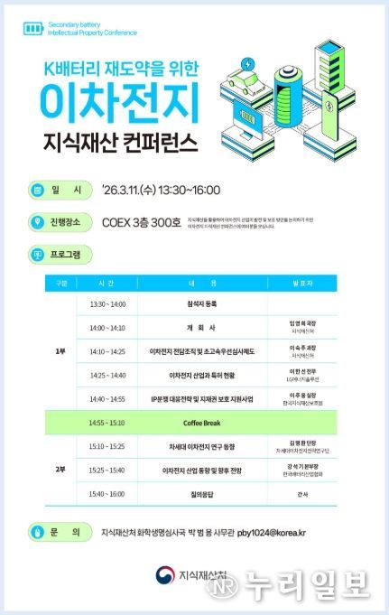 (누리일보) 지식재산처와 한국배터리산업협회는 3월 11일 13시30분 코엑스(서울시 강남구)에서 이차전지 지식재산 학술회의를 개최한다고 밝혔다.