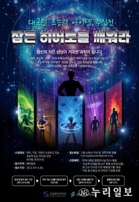 (누리일보) 미래의 꿈을 만드는 과학 기술 문화 이음터(플랫폼) 과학기술정보통신부 국립중앙과학관은 창의 나래관 신규 전시관 개관을 앞두고, 대국민 참여형 전시인 ‘초능력 품목(아이템) 수집전: 잠든 영웅(히어로)을 깨워라’를 3월 10일부터 시작한다고 밝혔다.