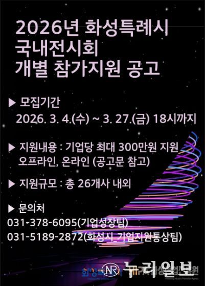 (누리일보) 화성산업진흥원은 관내 중소기업의 국내 판로 확대와 브랜드 인지도 제고를 위해 ‘2026년 화성시 국내 전시회 개별참가 지원사업’을 추진하고, 참여기업 26개사를 모집한다고 밝혔다.