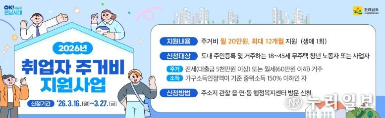 (누리일보) 전라남도가 청년의 주거비 부담 완화와 지역 정착 지원을 위해 ‘청년 취업자 주거비 지원사업’ 대상자 400명을 모집한다.