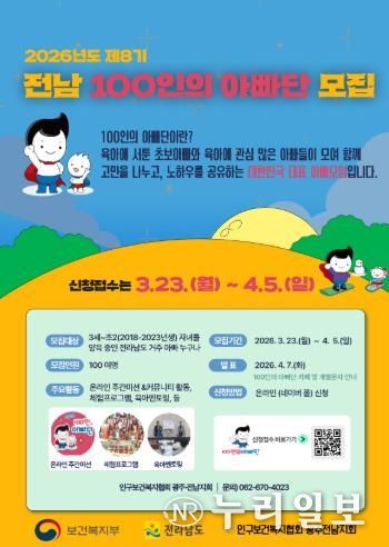 (누리일보) 전라남도는 아빠의 육아 참여를 확대하고 가족 중심의 건강한 양육문화를 확산하기 위해 2026년 제8기 전남 100인의 아빠단 참여자를 모집한다.