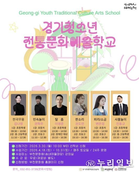 (누리일보) 부천문화원은 청소년들의 전통문화 참여 기회를 확대하고 경기지역 전통민속예술의 지속 가능한 전승 기반 마련을 위한 ‘2026 경기청소년전통문화예술학교’ 참여 학생을 모집한다.
