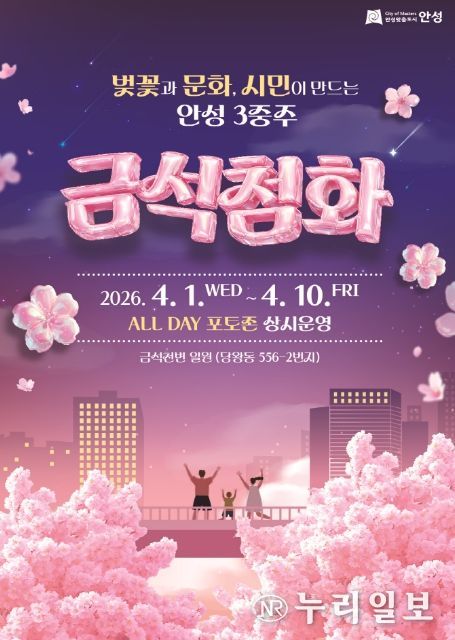 (누리일보) 안성시는 오는 4월 1일부터 10일까지 봄의 전령사인 벚꽃 개화 시기에 맞춰 금석천 일대에 시민들을 위한 금석첨화(金石添花)벚꽃 포토존을 집중 운영한다고 밝혔다.