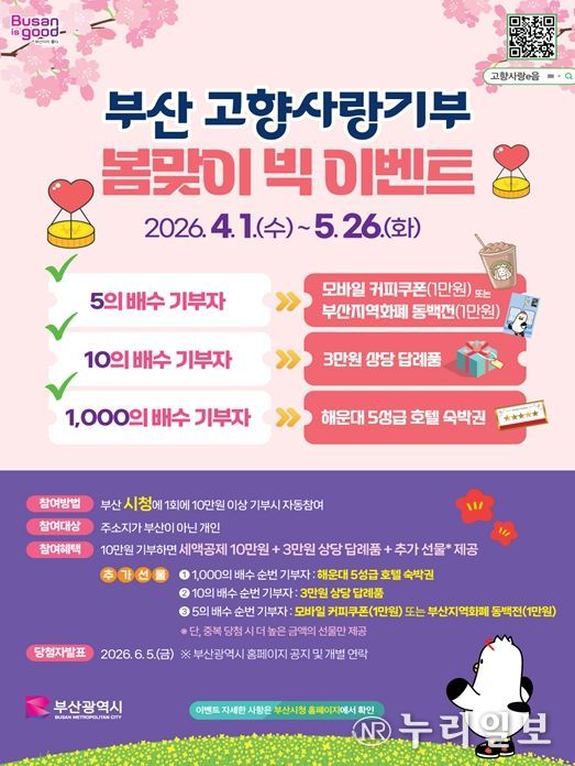(누리일보) 부산시는 2026년 부산에서 개최되는 '제20회 전국장애학생체육대회' 및 '제55회 전국소년체육대회'의 성공적인 개최를 기원하고, 고향사랑기부 참여를 독려하기 위해 '부산 고향사랑기부 봄맞이 빅 이벤트'를 추진한다고 밝혔다.