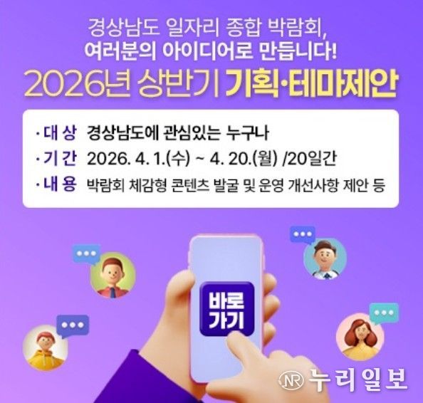 경남도는 첫 번째 공모 주제로 오는 9월 개최 예정인 ‘경남 일자리 종합 박람회’를 선정했다. 신규 콘텐츠 발굴은 물론 기존 박람회 운영 과정에서의 불편 사항 개선까지 등 수요자가 직접 체감한 다양한 제안을 수렴해, 박람회 기획 단계부터 적극 반영할 계획이다.