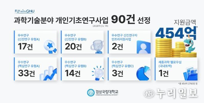 이는 지난해 63건, 319억 894만여 원에 비해 건수로는 27건(42.9%), 금액으로는 135억 1860만여 원(42.4%) 증가한 것으로 경상국립대학교의 기초연구의 방향과 우수연구자 양성 전력, 연구역량 등이 전반적으로 인증받은 결과로 풀이된다(2025년 대비 2026년도 사업 유형이 일부 개편됐으나, 유사 유형 기준으로 재분류하여 정리).