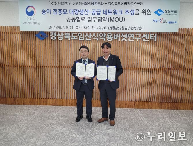 (누리일보) 경상북도산림환경연구원은 임산식약용버섯연구센터에서 1일 산림청 국립산림과학원과 ‘송이 접종묘 대량생산·공급 네트워크 조성’을 위한 업무협약(MoU)을 체결했다.