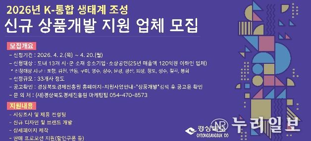 (누리일보) 경상북도는 도내 유망 중소기업·소상공인의 제품 경쟁력 강화를 위해 ‘2026년 K-통합 마케팅 생태계 조성사업’의 일환으로 상품 기획부터 디자인·마케팅까지 전 과정을 지원하는‘신규 상품개발 지원사업’에 참여할 기업을 모집한다.