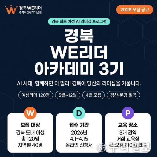 (누리일보) 경상북도와 경북여성정책개발원은 지역사회와 함께 성장하고 싶은 여성리더를 대상으로‘경북 WE리더 아카데미 3기’참가자를 4월 1일부터 4월 15일까지 모집한다.