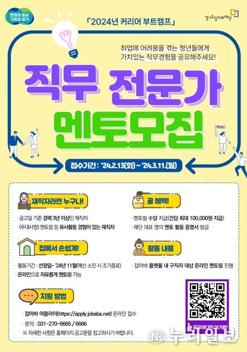 (누리일보) 경기도일자리재단이 ‘커리어 부트캠프 사업’ 온라인 멘토링에 참여할 멘토를 내달 11일까지 모집한다.