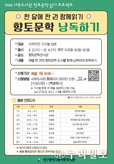 (누리일보) 대구서부도서관은 12월까지 도서관 향토문학전시관(지하 1층)에서 ‘한 달에 한 권, 향토문학 낭독하기’를 운영하고 있다.