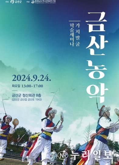 (누리일보) 충남역사문화연구원 내포문화진흥센터는 충청남도 무형유산 금산농악의 전승과 활성화를 위하여, 오는 9월 24일 오후 1시부터 금산군 청산회관에서 '금산농악 가치발굴 학술세미」를 개최한다고 밝혔다.