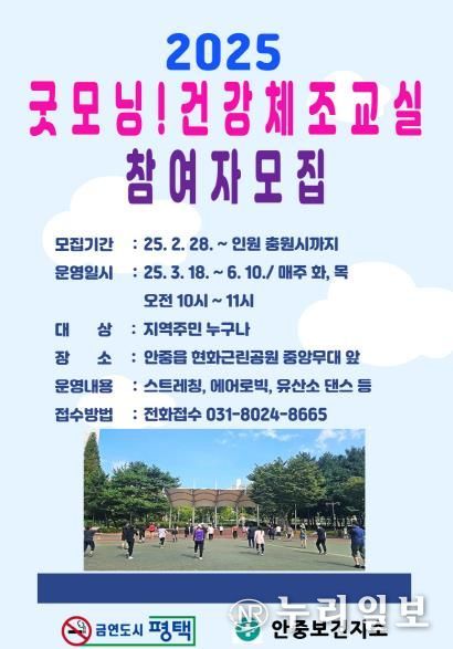 (누리일보) 평택시(시장 정장선) 안중보건지소에서는 지난 2월 28일부터 ‘굿모닝! 건강체조교실’ 참여자를 모집하고 있다.