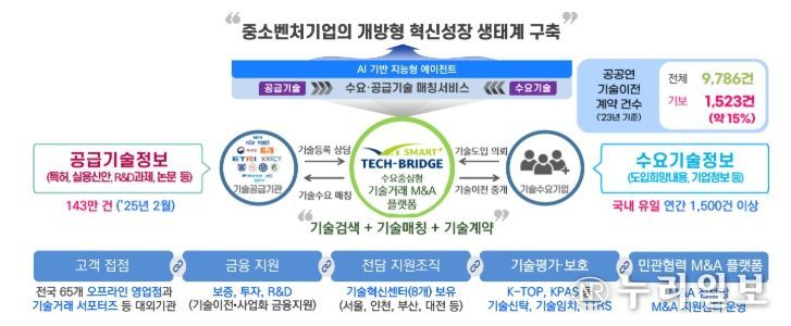 파산기업 기술거래는 파산관재인이 관할하는 특허를 기술보증기금에 중개를 위탁하고, 기술보증기금은 AI 기술거래 플랫폼 ‘스마트테크브릿지’를 활용하여 매칭·이전계약 체결을 지원하는 사업이다. 올해 2월 기술보증기금은 서울회생법원으로부터 27건을 시범적으로 중개위탁 받아 3주 만에 10건을 매칭하여 계약체결을 지원하고 있다.