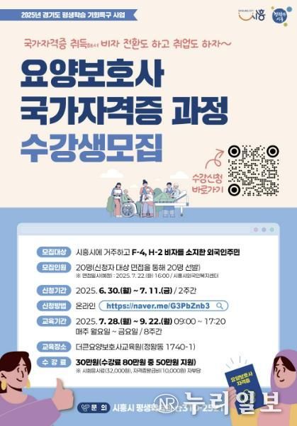 (누리일보) 시흥시는 2025년 경기도 평생학습 기획특구 사업의 일환으로, 외국인주민의 안정적인 지역 정착과 취업을 지원하기 위한 ‘요양보호사 국가자격증 과정’을 개설하고, 6월 30일부터 7월 11일까지 수강생 20명을 모집한다.