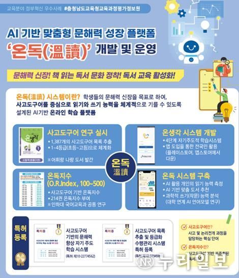 (누리일보) 충남교육청은 2025년 교육분야 정부혁신 우수사례 경진대회에서 충남교육청 우수사례 ‘인공지능(AI) 기반 맞춤형 문해력 성장 플랫폼 '온독(溫讀)' 개발 및 운영’이 시도교육청 분야 1위 “대상”으로 선정됐다고 밝혔다.