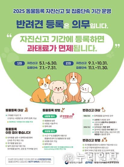(누리일보) 전북특별자치도가 반려견 등록을 하지 않았거나 변경신고를 미처 하지 못한 보호자들을 위해 오는 9월 1일부터 10월 31일까지 ‘2025년 2차 동물등록 자진신고기간’을 운영한다. 이 기간에 신규 등록이나 변경신고를 하면 과태료가 면제된다.