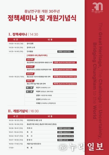 (누리일보) 해 개원 30주년을 맞은 충남연구원이 1일 비전 선포식과 정책 세미나를 연구원에서 개최했다.