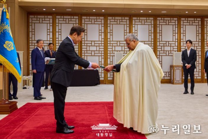 (누리일보) 이재명 대통령은 오늘 오후 대통령실에서 개최된 신임장 제정식에서 신임 주한 상주대사 7명으로부터 신임장을 제출받았다. 신임장 제정식은 파견국의 국가원수가 자국의 신임 대사에게 수여한 신임장을 주재국 국가원수에게 전달하는 절차로, 이번 제정식은 우리 신정부 출범 이후 처음 개최된 것이다.