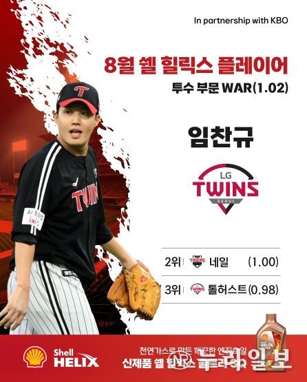 ‘쉘힐릭스플레이어’는 WAR(대체 선수 대비 승리 기여도)를 기준으로 선정하며, 8월 투수 부문에서는 LG 임찬규가 WAR 1.02로 1위를 차지했다. 임찬규는 8월 한 달간 총 29 2/3이닝(공동 11위)을 소화하며 3승(공동 5위)을 기록했다. 이 기간 평균자책점 2.12(3위), WHIP 1.28(15위)를 기록하며 안정적인 피칭으로 팀 선발진의 한 축을 든든히 지켰다.