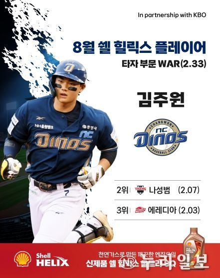 (누리일보) KBO와 한국쉘석유주식회사(이하 ‘한국쉘’)가 함께 시상하는 ‘쉘힐릭스플레이어’의 2025 신한 SOL뱅크 KBO 리그 8월 수상자로 LG 임찬규와 NC 김주원이 선정되었다.