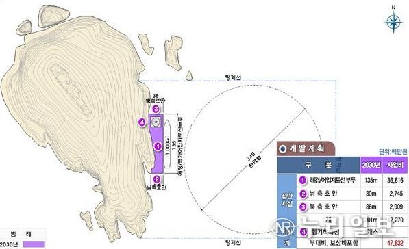전액 국비 사업으로 주요 시설은 다목적부두(135m), 북측호안(36m), 남측호안(30m), 헬기 착륙장(1식) 등이다.