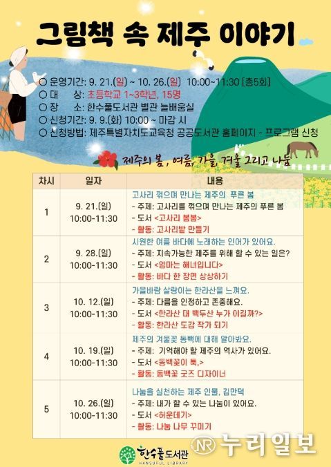 (누리일보) 제주도교육청 한수풀도서관은 오는 21일부터 10월 26일까지 매주 일요일 초등학교 1~3학년 어린이를 대상으로 제주 관련 그림책 읽기 프로그램 ‘그림책 속 제주 이야기’를 운영한다.