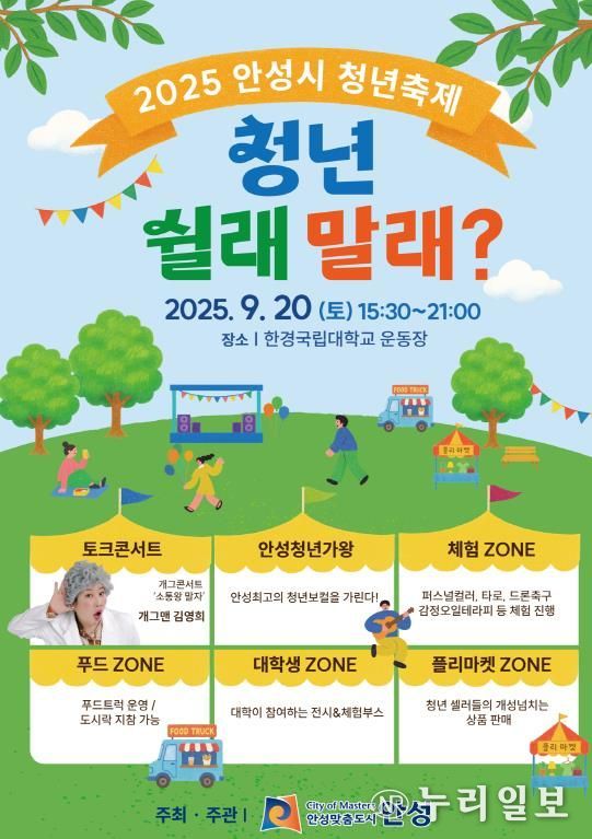 (누리일보) 안성시는 청년의 날을 기념해 ‘2025 안성시 청년축제(부제: 안성청년 쉴래말래?)’를 9월 20일 15:30부터 21:00까지 한경국립대학교 운동장에서 개최한다. 축제는 메인무대 프로그램과 4개 체험 ZONE으로 구성돼 청년이 쉬고 즐기며 서로 연결되는 청년 참여형 축제로 꾸며진다.