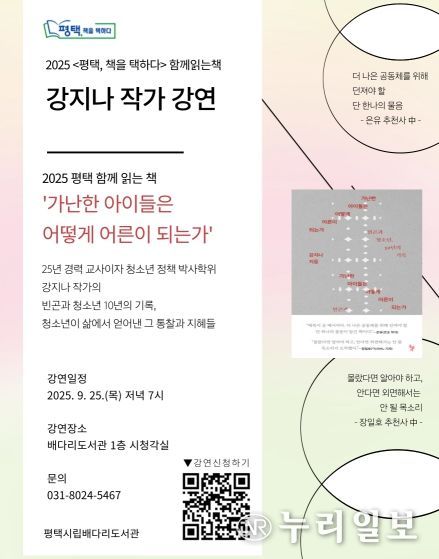 (누리일보) 평택시 시민독서운동 '평택, 책을 택하다' 2025년 함께 읽는 책 '가난한 아이들은 어떻게 어른이 되는가' 강지나 작가 강연이 9월 25일 저녁 7시 배다리도서관에서 진행된다.