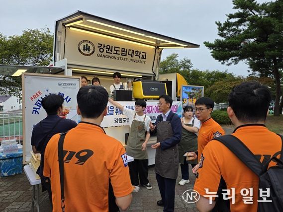 (누리일보) 강원도립대학교는 9월 9일 아침 강북공설운동장 비상급수 운반차량 차고지에서 강릉시 장기 가뭄 극복을 위해 현장에서 헌신하고 있는 급수지원 소방대원들에게 커피와 음료, 빵을 무료로 제공했다.